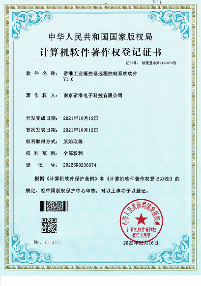 南京帝淮电子科技有限公司,国内工业遥控器行业领军企业,自主研发、定制、非标设计各类工业级无线遥控器、工业级有线控制器、智能化自主算法逻辑的本地控制器等系列产品。已经申请及正在申请的技术专利、外观专利有近三十项左右,并通过了CE欧盟认证、国家级试验检验报告、EMC电磁兼容认证等。
